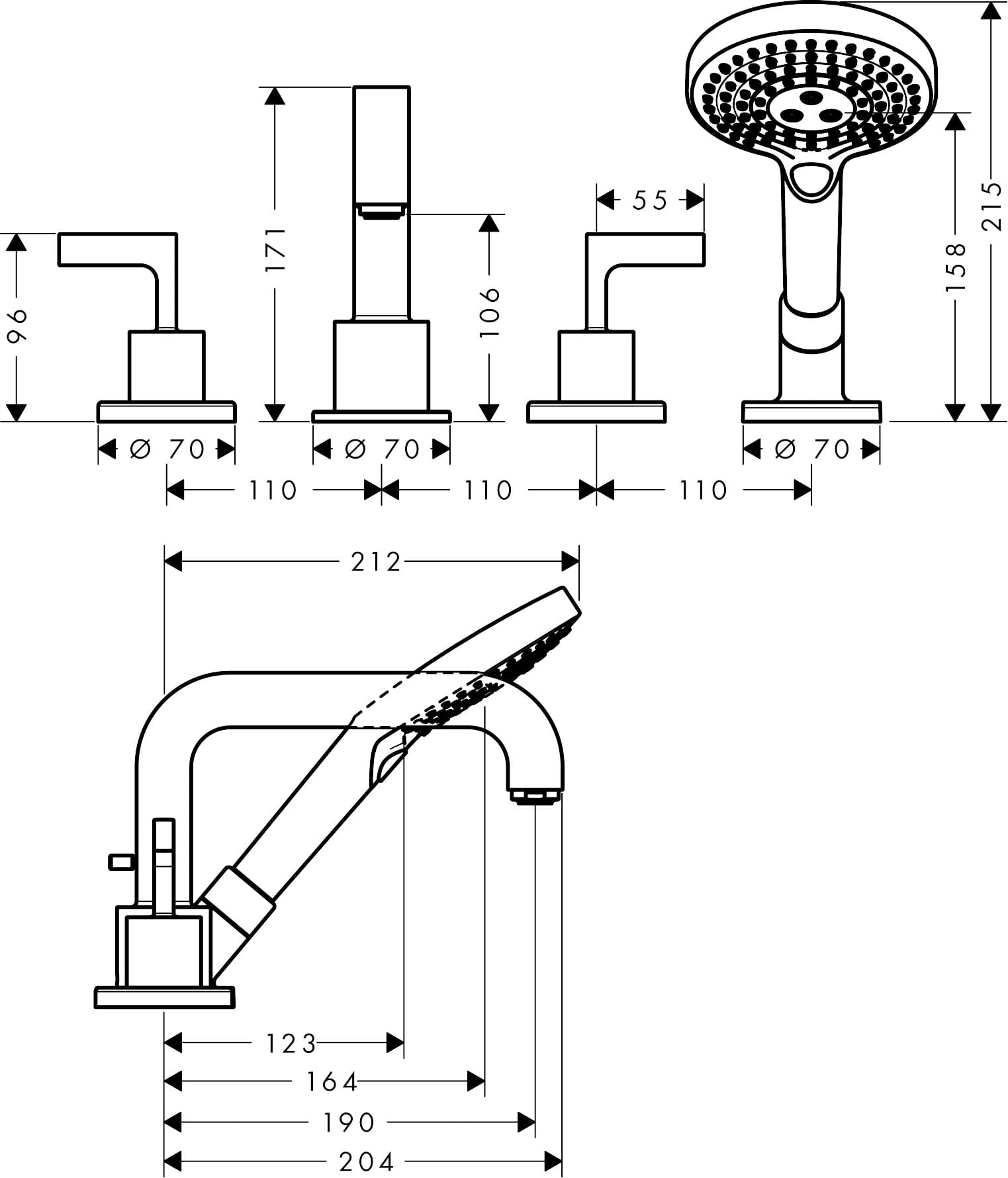 ✅ w składzie: 4-otworowa bateria do montażu na brzegu wanny, główka prysznicowa, uchwyt prysznicowy, wąż prysznicowy