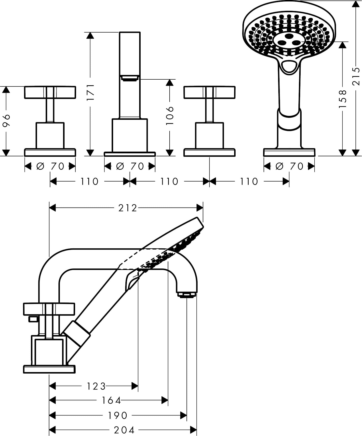 ✅ w składzie: 4-otworowa bateria do montażu na brzegu wanny, główka prysznicowa, uchwyt prysznicowy, wąż prysznicowy