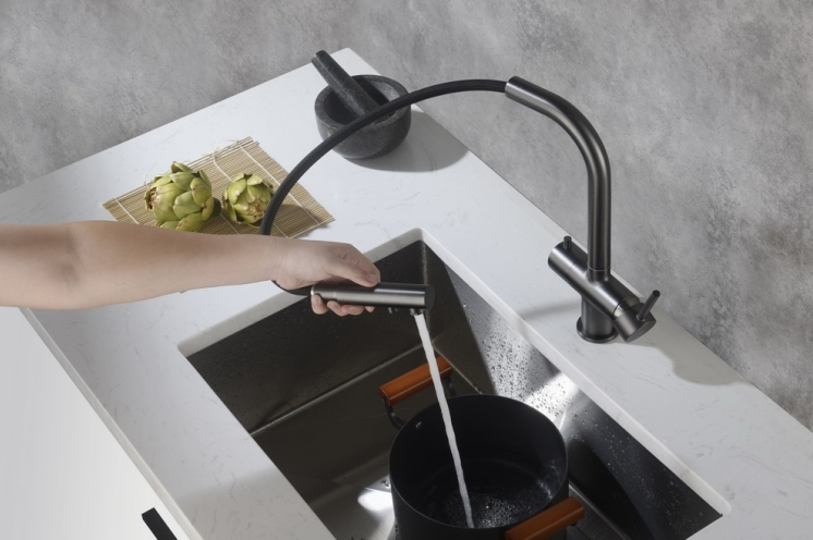 Ta grafitowa bateria kuchenna ma także wyciąganą wylewkę, z opcją obrotu o 360 stopni. To bardzo duże udogodnienie, co jest szczególnie ważne podczas korzystania z dużych zlewozmywaków. Dzięki niej można łatwo opłukać komory zlewu, a także sprawnie umyć wysokie naczynia, które nie mieszczą się bezpośrednio pod baterią. Zintegrowany magnes pozwala na szybkie schowanie końcówki wylewki po zakończeniu jej użytkowania.