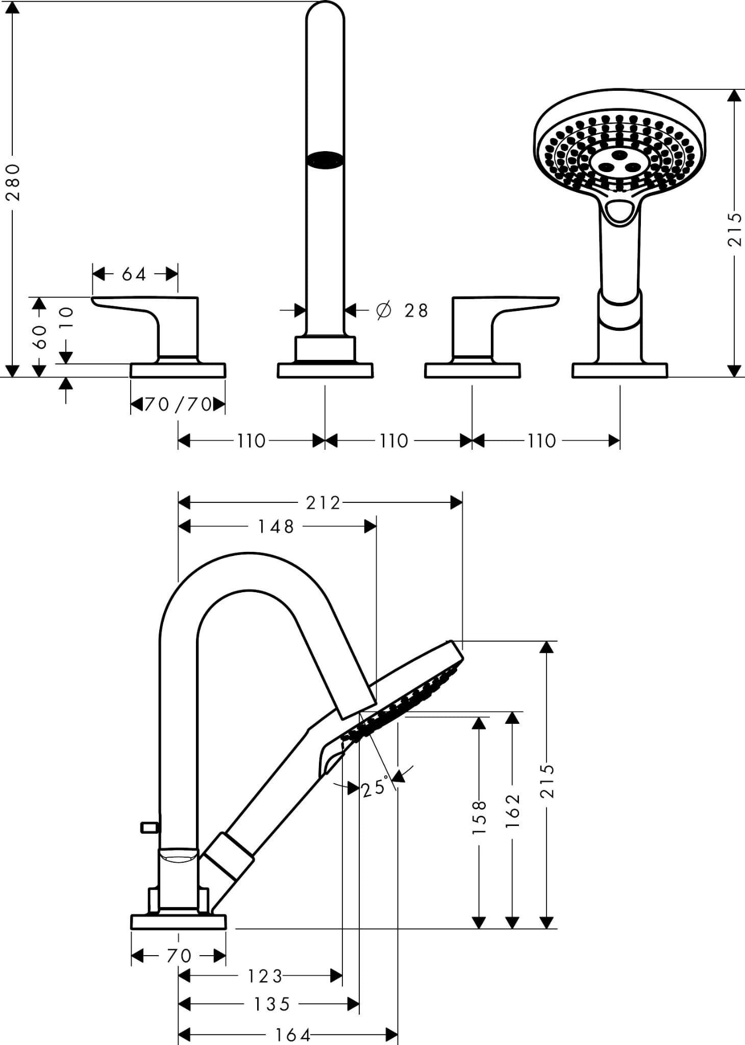 ✅ w składzie: 4-otworowa bateria do montażu na brzegu wanny, główka prysznicowa, uchwyt prysznicowy, wąż prysznicowy