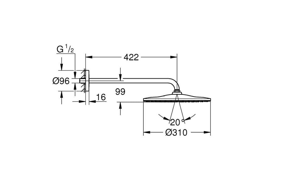 Ramię prysznicowe 422 mm odsuwa głowicę od ściany, dzięki czemu woda spada w wygodnym miejscu – w samym centrum strefy prysznica. Deszczownica ma możliwość delikatnego odchylenia (ok. 10°) dla lepszego dopasowania do użytkownika.