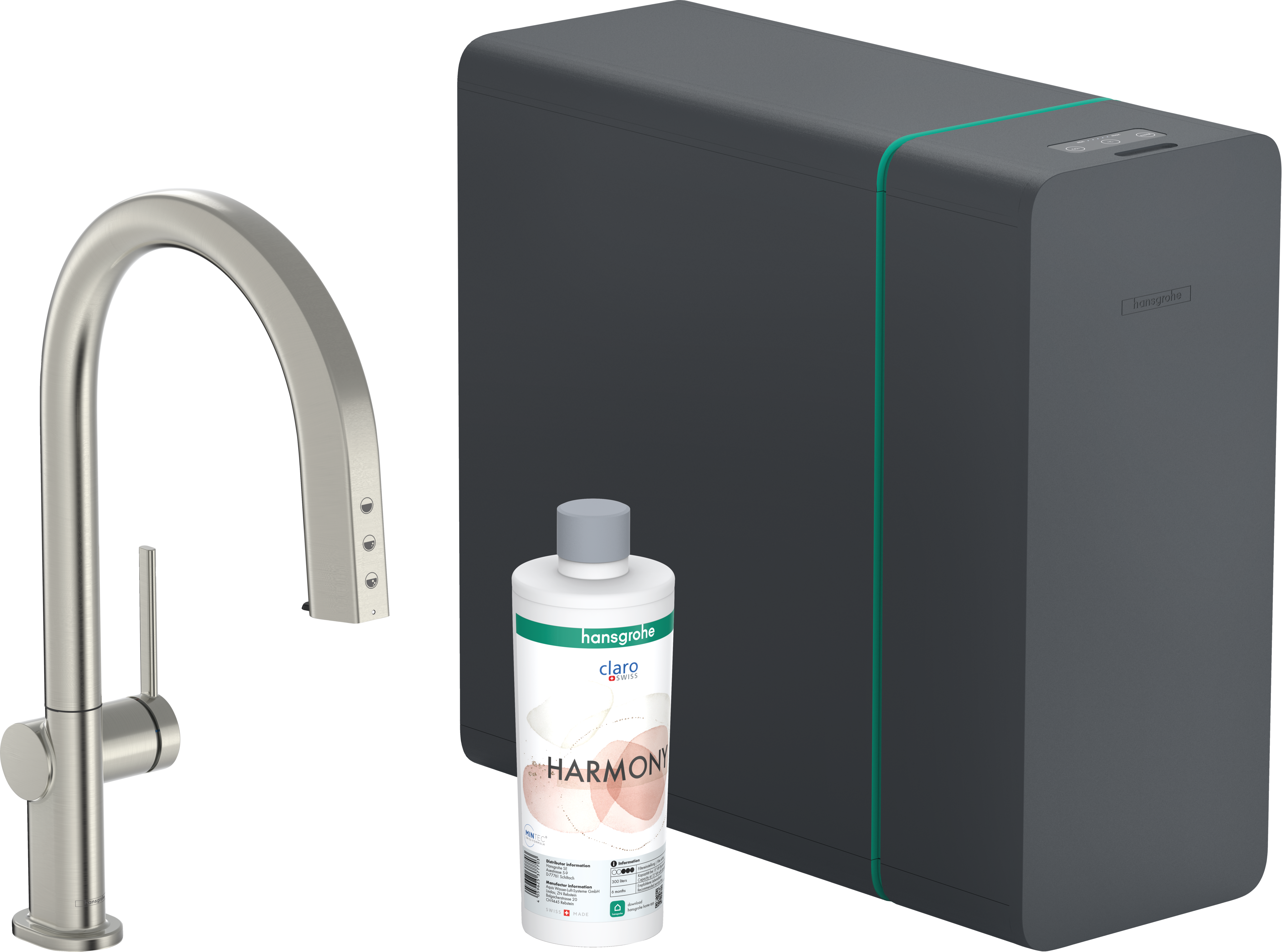 ✅ w składzie: jednouchwytowa bateria kuchenna, pojemnik na wąż, głowica filtra, wkład mineralizatora Harmony z filtrem, SodaBase