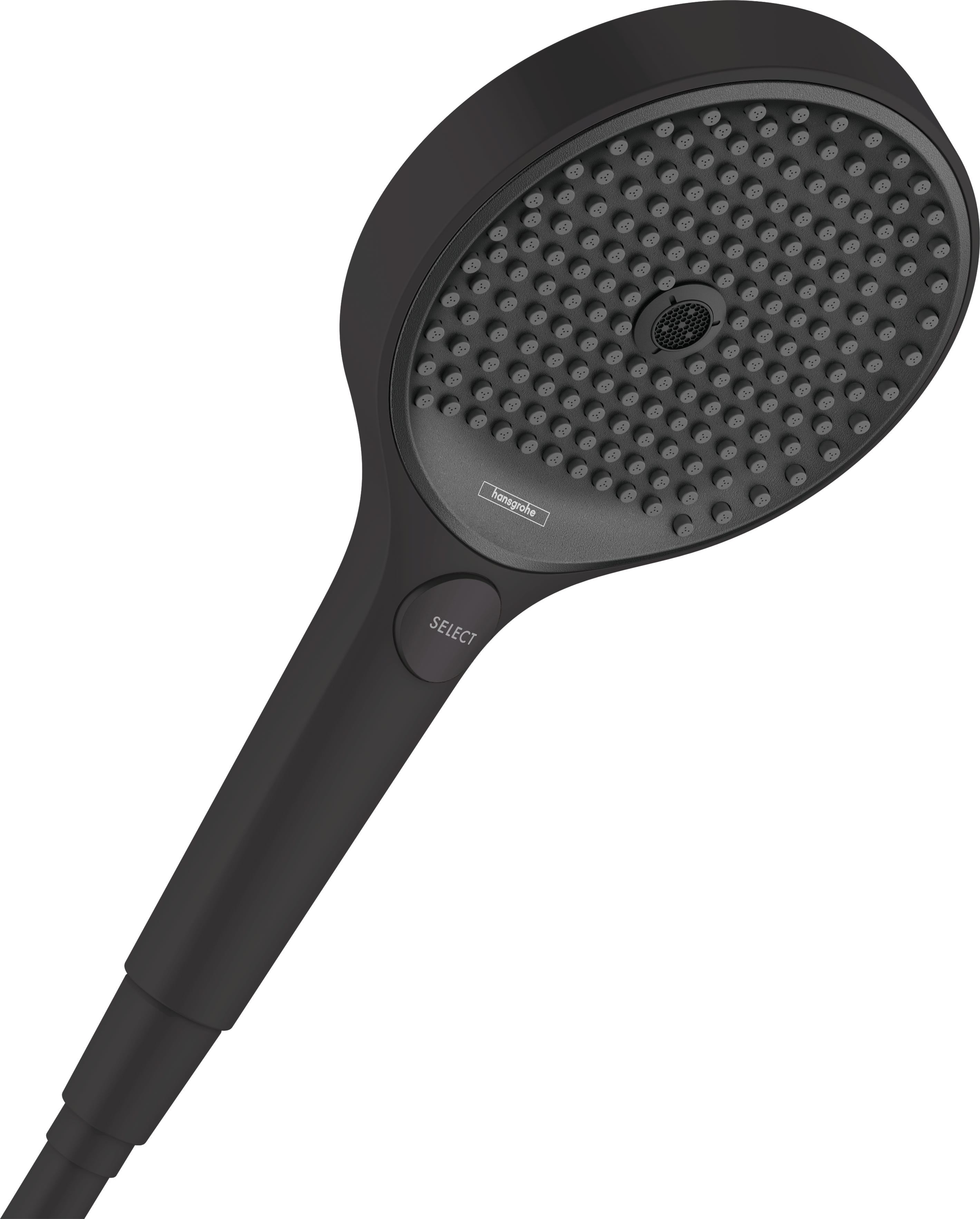 Modne, szlachetne wzornictwo: innowacyjna główka prysznicowa rozpieszcza powierzchnią w modnym matowym czarnym kolorze i dużą, okrągłą tarczą strumieniową (130 mm)