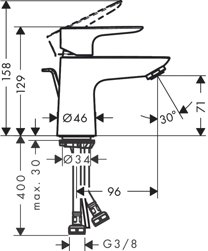 W zestawie: Jednouchwytowa bateria umywalkowa, węże przyłączeniowe, mocowanie, instrukcja montażu