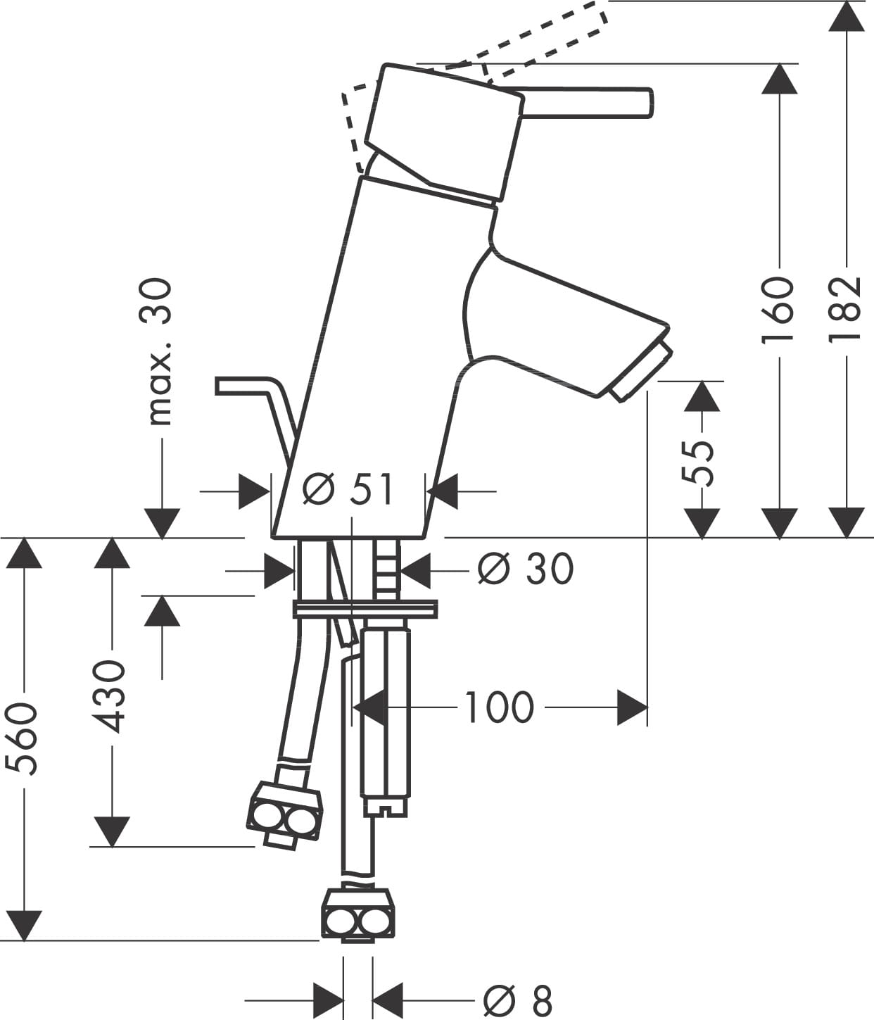 Prosta instalacja: Baterię można połączyć za pomocą elastycznych węży przyłączeniowych (G ⅜) do przyłącza wody (wymiar: DN15)