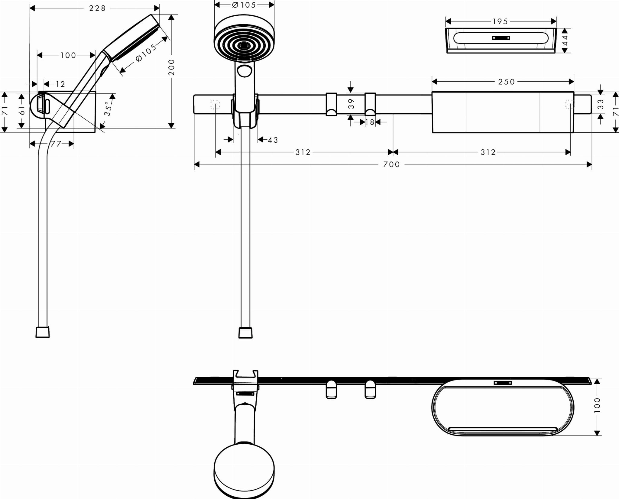 ✅ w składzie: wąż prysznicowy, kosz do przechowywania, suwak, wieszak na ręcznik, główka prysznicowa, ściągaczka, panel ścienny