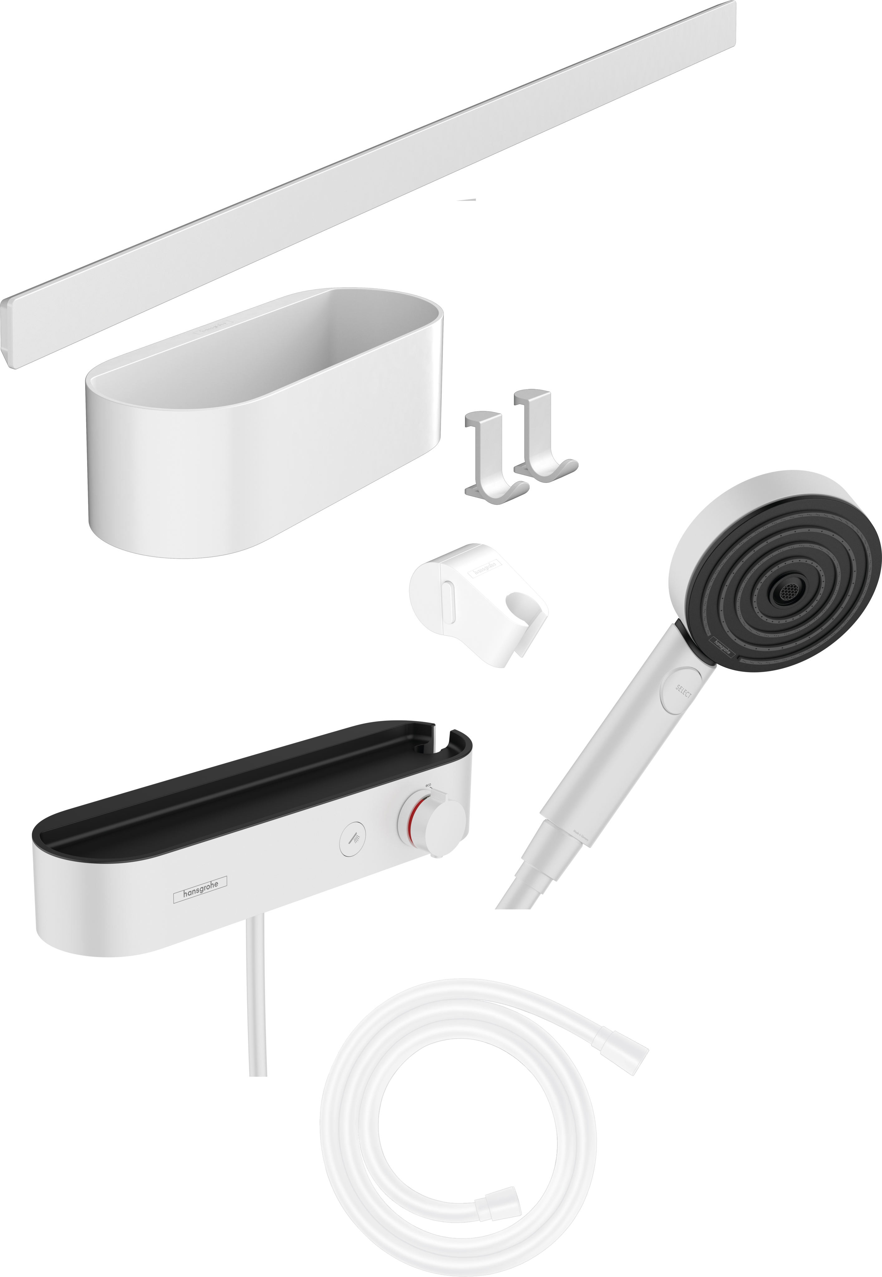 Hansgrohe WallStoris Pakiet główka prysznicowa 105 3jet EcoSmart Activation, bateria termostatyczna, panel ścienny 70 cm i akcesoria WallStoris Biały Matowy