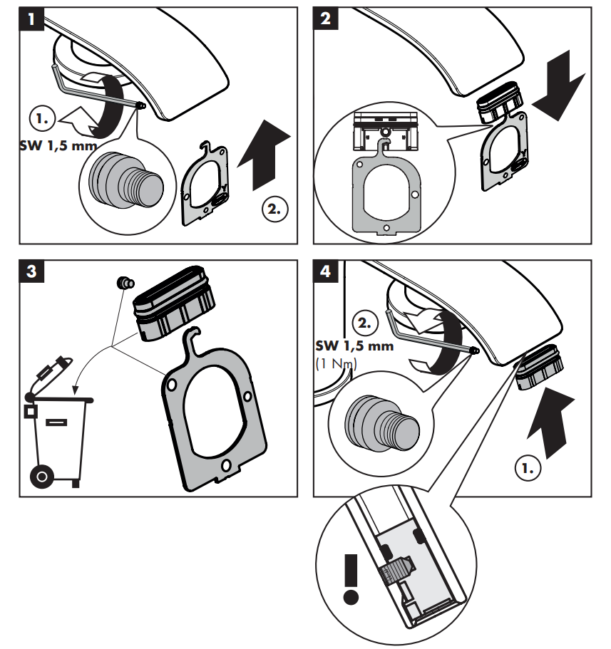Wciśnij nową końcówkę i dokręć śrubę zabezpieczającą (zalecany moment: 1 Nm), aby zapobiec wypadnięciu elementu pod ciśnieniem wody.