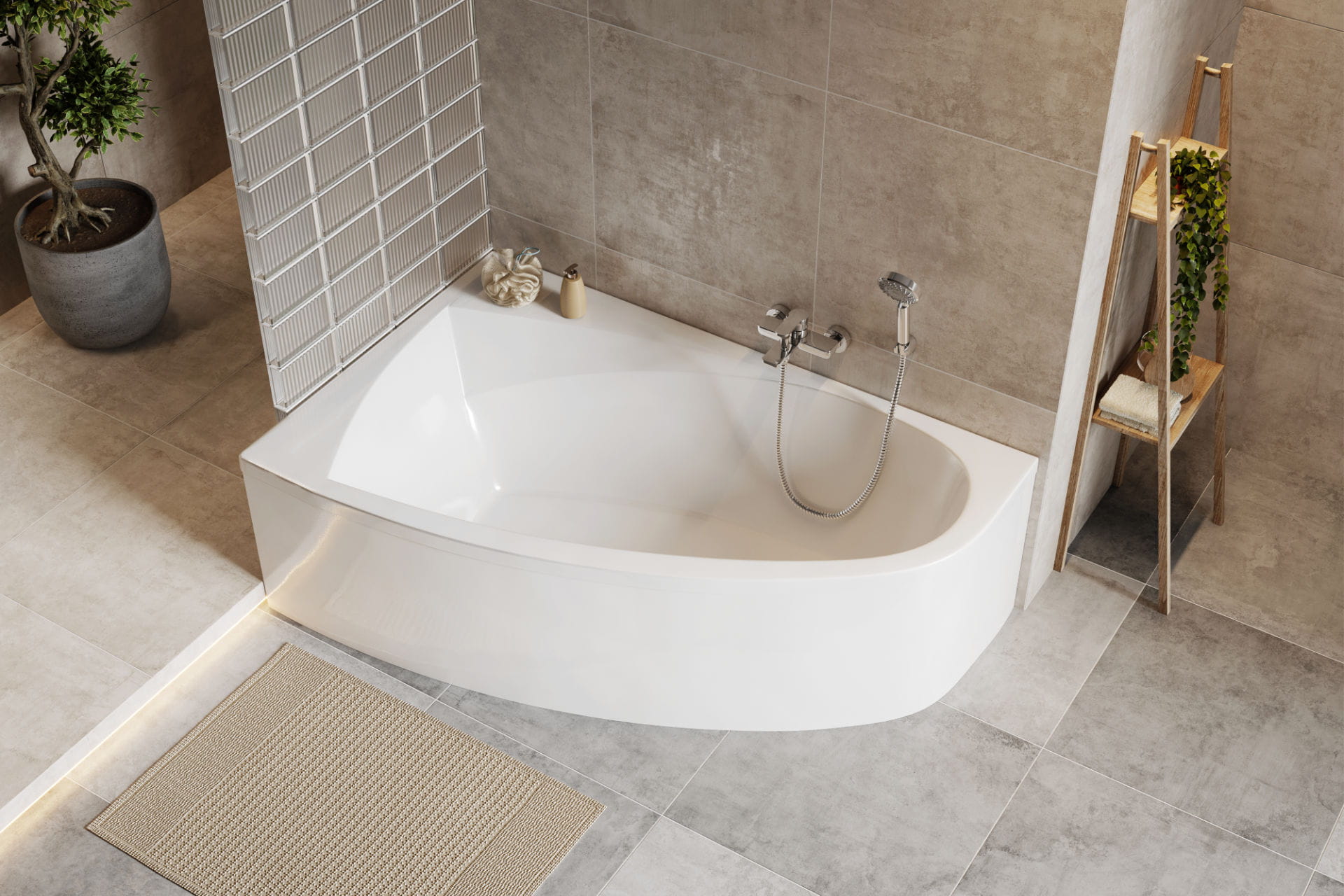 Wannę narożną AQUARIA COMFORT wyróżnia oryginalny projekt, w którym zestawiono ze sobą asymetryczną krawędź zewnętrzną z gładką symetrią linii wewnętrznej. Ten intrygujący kontrast sprawia, że będzie pięknie wyglądać w Twojej łazience zaaranżowanej na przykład w stylu pop-art, z mocnymi kolorami i geometrycznymi wzorami. Jej dodatkową zaletą jest kształt, który świetnie się sprawdza w większych pomieszczeniach o nietypowych rozmiarach, stając się jego największą ozdobą.