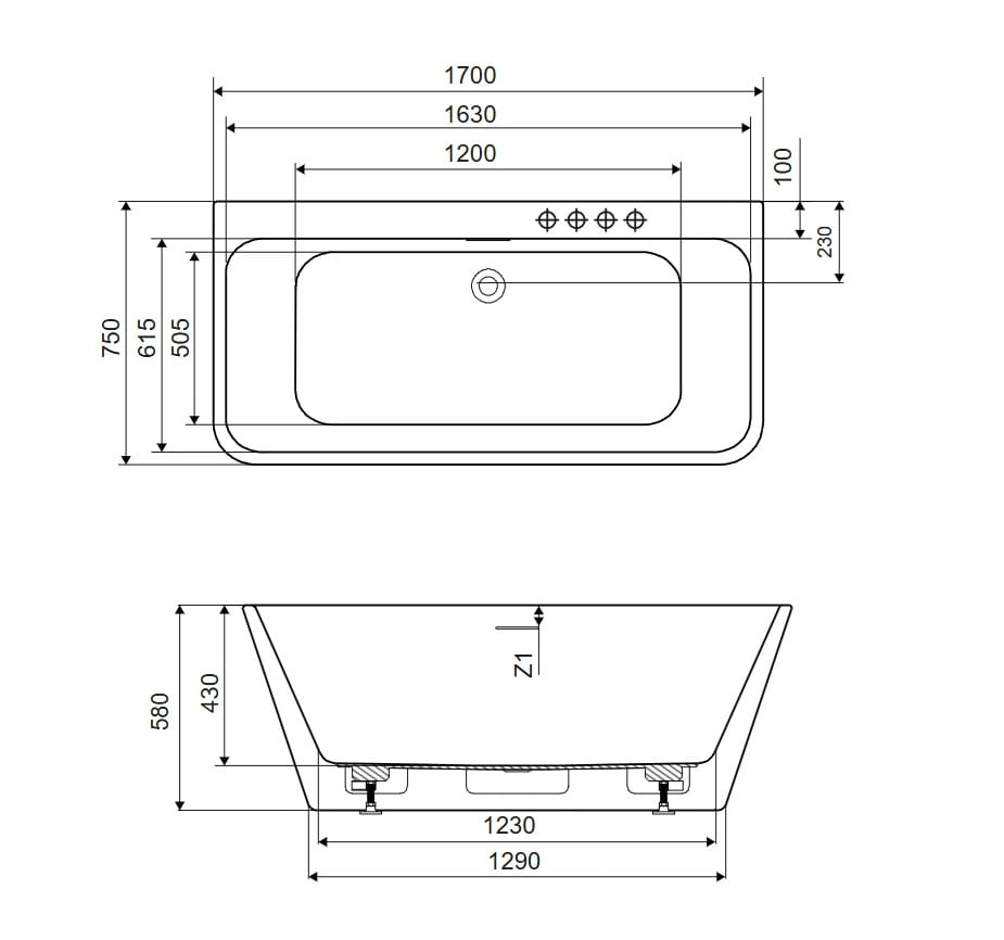 Wykonana jest ze 100% akrylu sanitarnego. Występuje w 3 rozmiarach 150, 160 i 170 cm. Wanna ze zintegrowaną obudową dodatkowo wzmocniona powierzchnia odkładcza, która umożliwia zamontowanie baterii wannowej. Posiada uniwersalny przelew szczelinowy, syfon z korkiem click-clack w kolorze chrom, w komplecie ze stelażem i nóżkami.