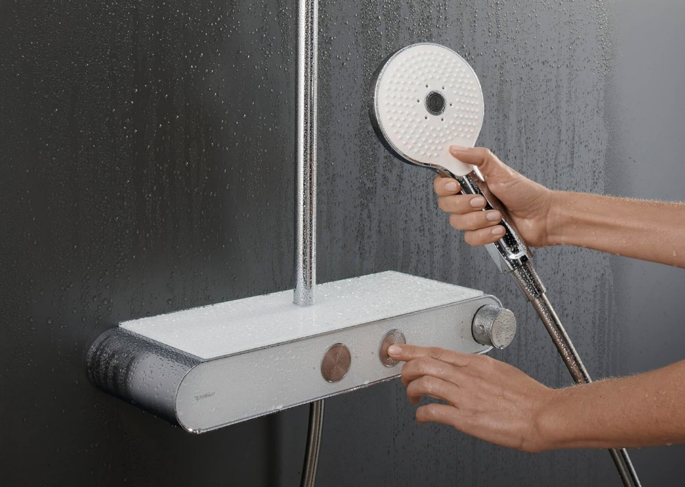 w zestawie: wąż prysznicowy 1600 mm, słuchawka prysznicowa 3 Jet Click! średnica 120 mm, głowica prysznicowa 1 strumień średnica 230 mm, Chrom/Biały, 1218 mm