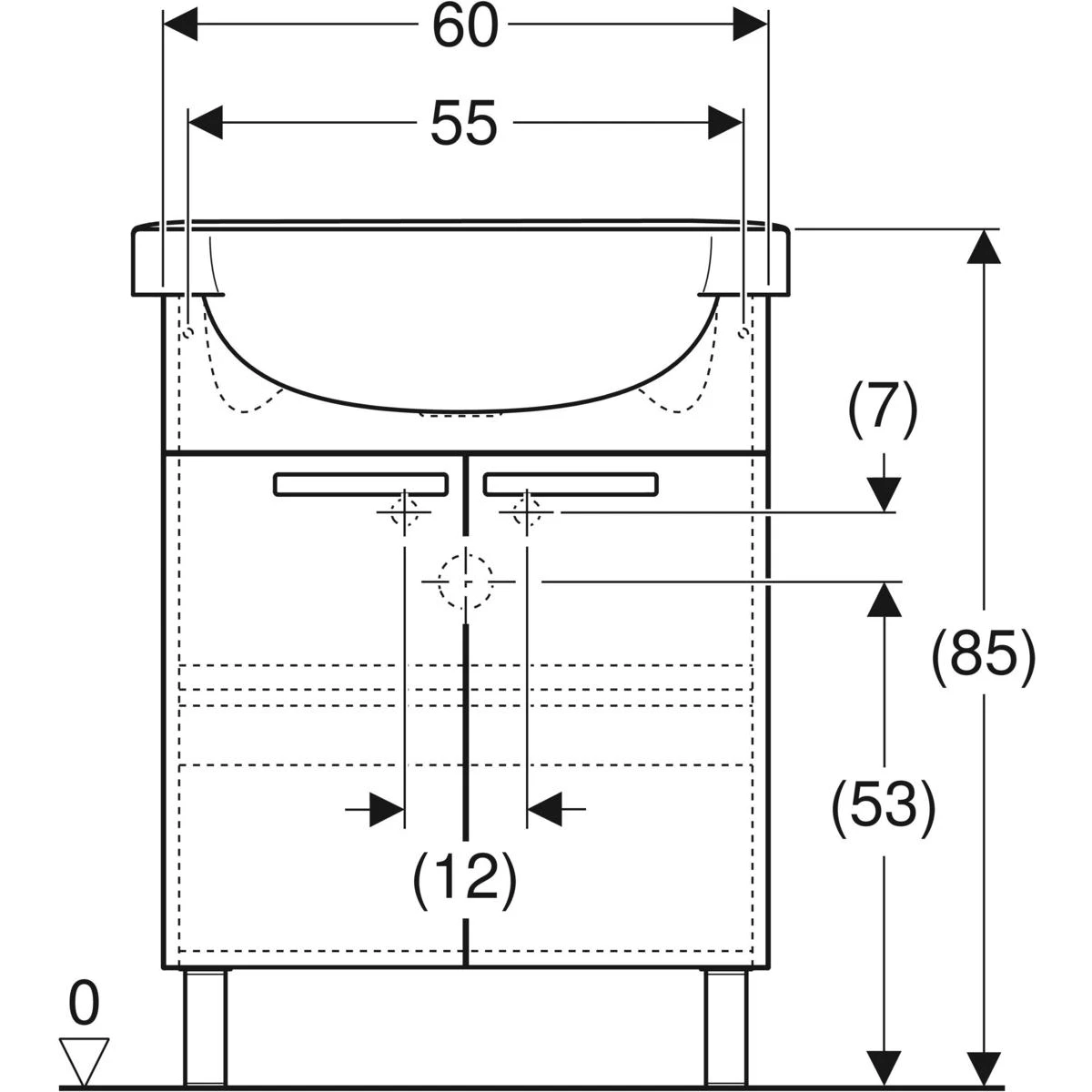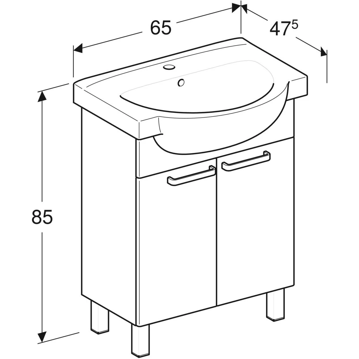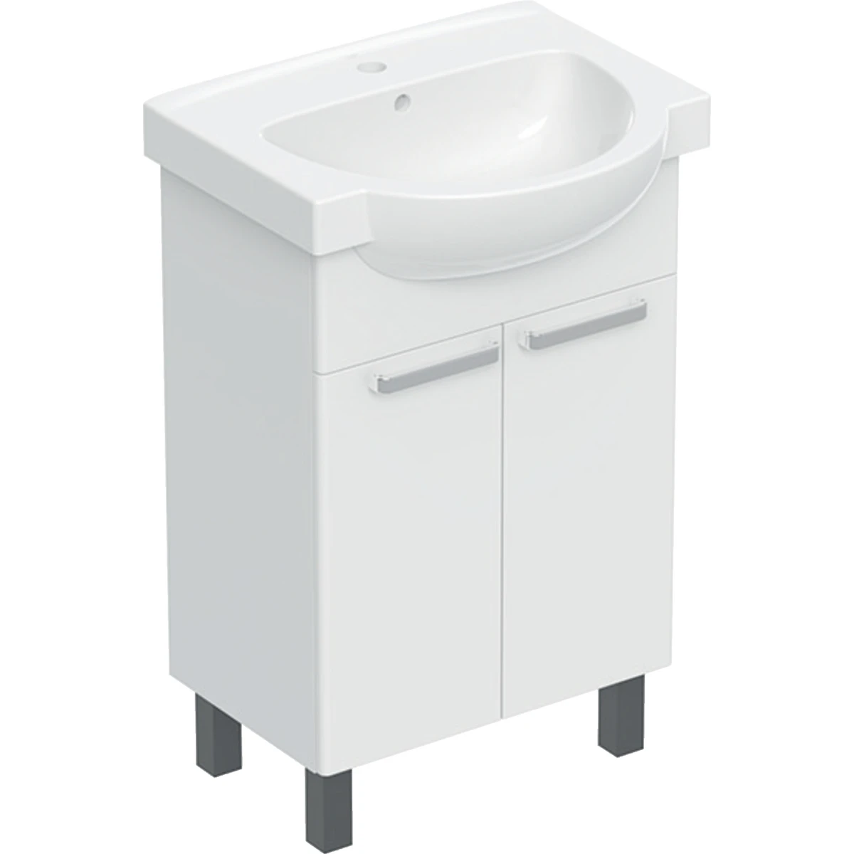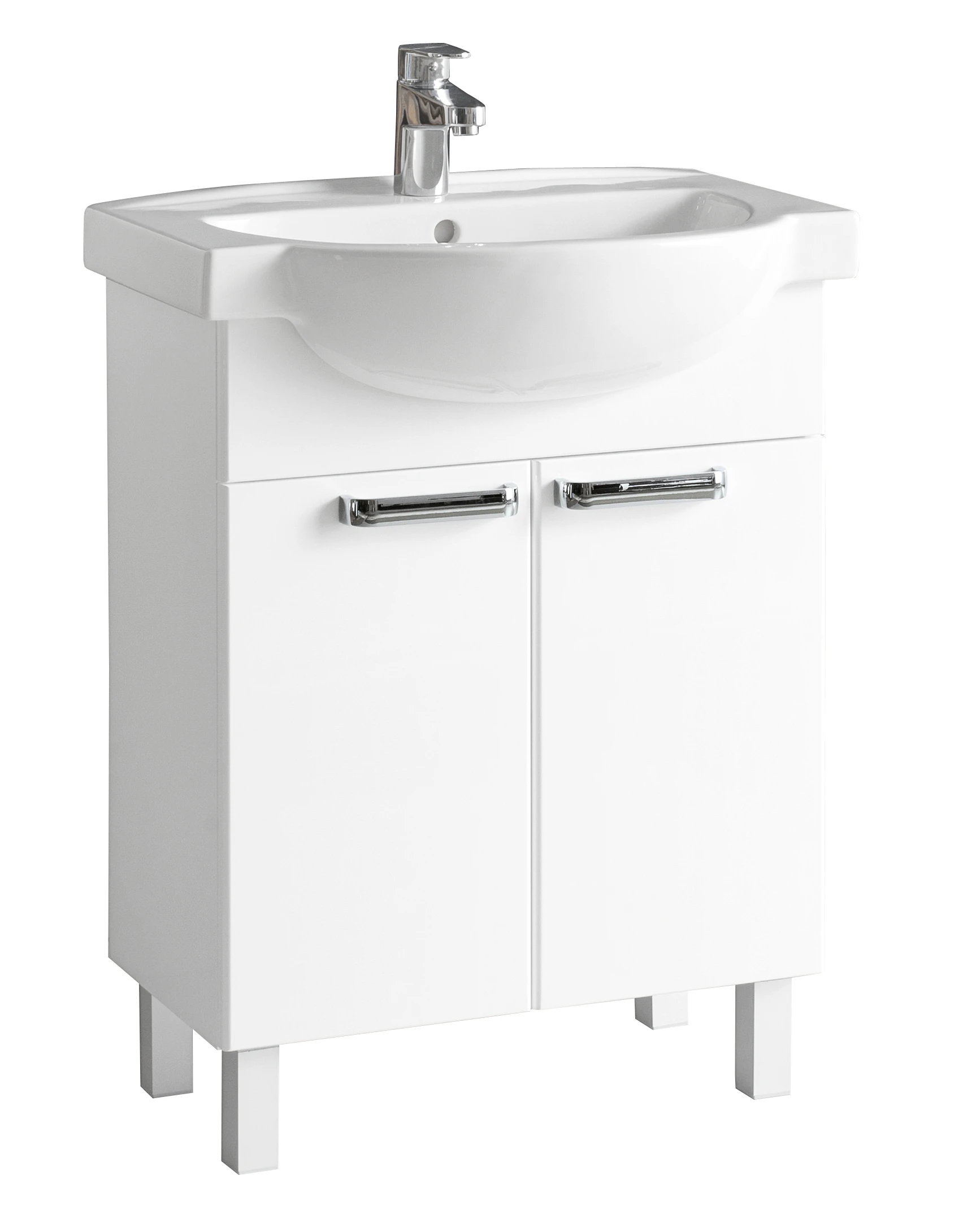 Zestaw meblowy Freja składający się z: Umywalka meblowa 65 x 48 cm + Szafka podumywalkowa 60 x 67 x 32 cm, Kolor: biały połysk. 2 drzwi, 1 nieregulowana półka z płyty. W komplecie: zestaw montażowy, instrukcja montażu, uchwyty, nogi (kolor - chrom błyszczący).
