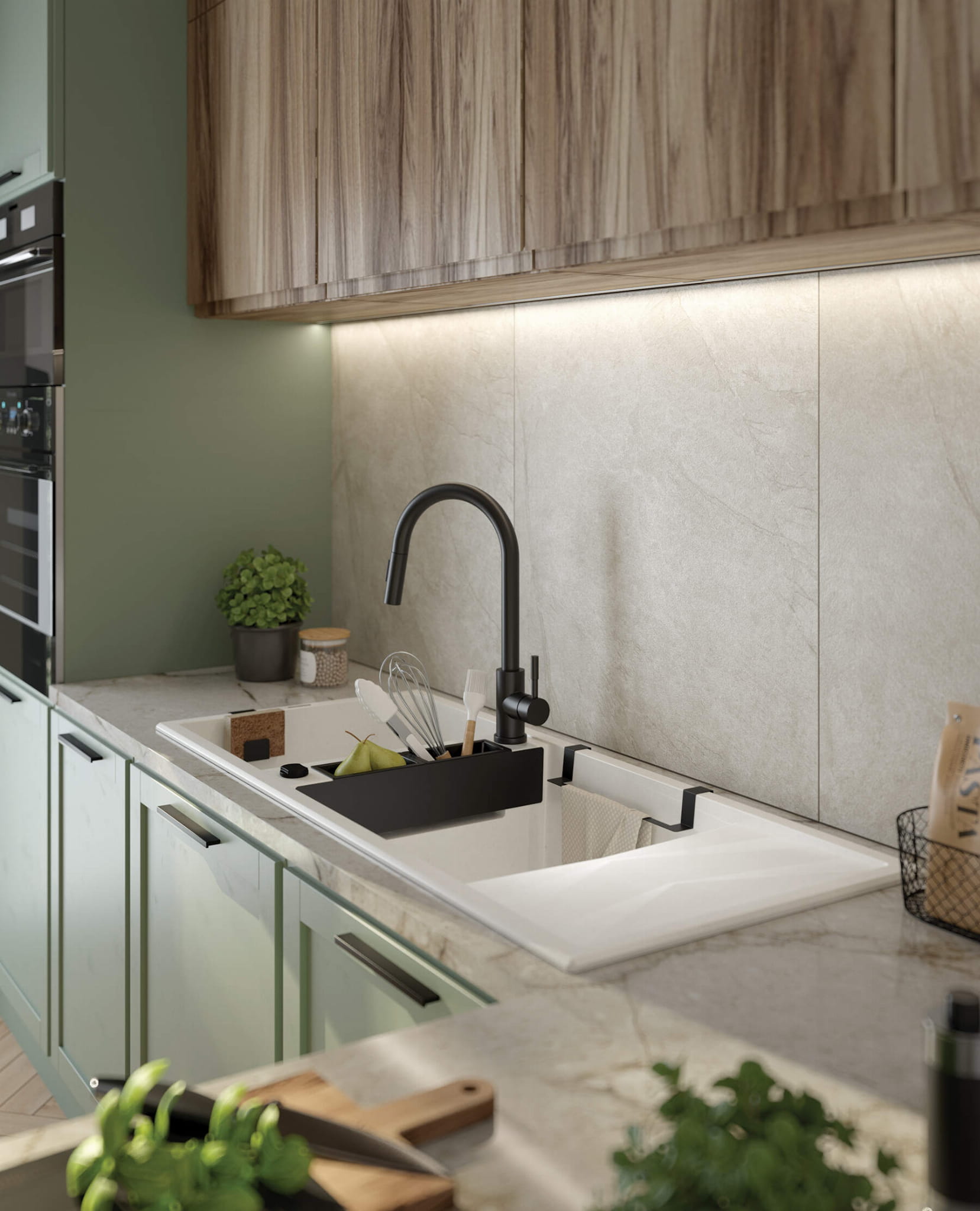 Opcjonalnie zlewozmywak można wyposażyć w koszyki, reling i haczyk ze stali nierdzewnej. Mieszcząc w nich myjkę czy kuchenną ściereczkę i oddzielając je od innych przedmiotów, zwiększasz higienę podczas pracy w kuchni. Koszyki montowane na bocznej półce stanowią praktyczną przestrzeń do przechowywania przyborów kuchennych. Haczyk i reling można również dokupić oddzielnie. Dedykowane zlewozmywakom akcesoria występują w 3 wykończeniach do wyboru: stal szczotkowana, bianco oraz nero.